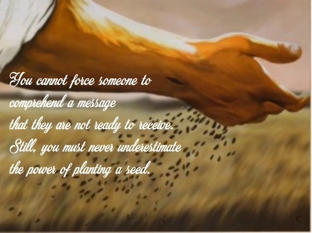 I remember being mesmerized as a child by the rings created at the moment of impact when the rock hit the surface of the water. It starts with one action to create a reaction. People cannot respond to something they don’t understand. That one seed will be multiplied by the hand of our creator in more ways than you will ever realize in this lifetime.